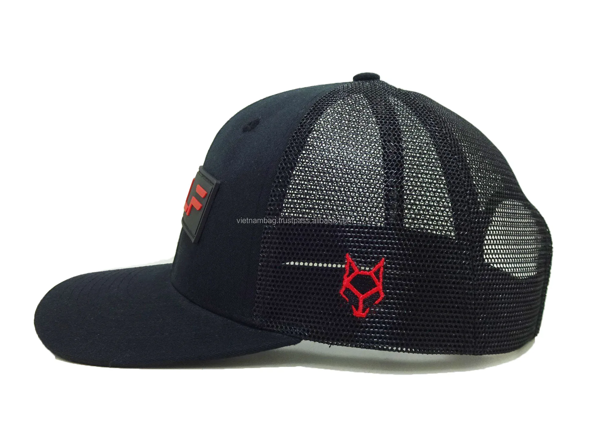 • Wholesale High Quality Custom Rubber Logo Black Color Hiphop Style Mesh Back Cotton/Mesh Fabric Trucker Hat in Vietnam Factory