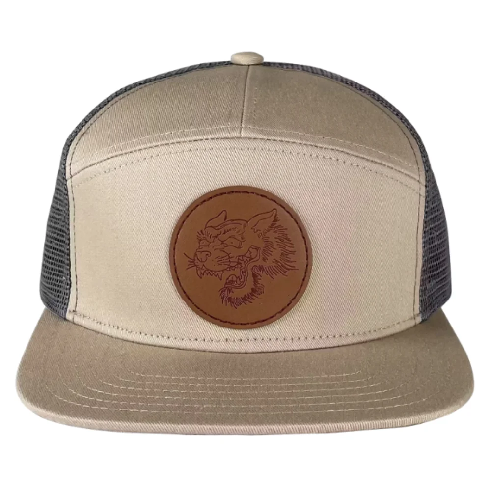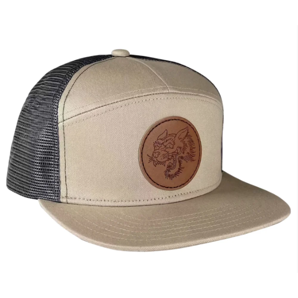 Engraved Leather Patch Hat 7 Panel Gorras Breathable Mesh Adjustable Plastic Single Row Buckle Snapback Flat Brim Wholesale OEM 98 Views