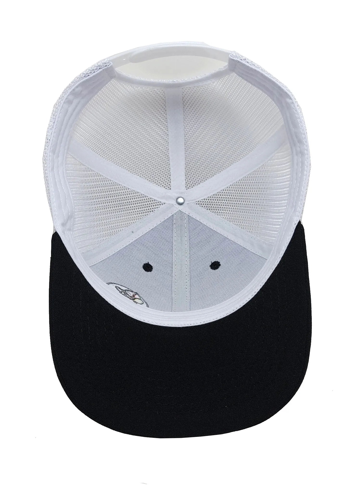 • Woven Patch logo Foam Trucker Hat for Men and Women 5-Panel Flat Brim High Quality White/Blue Color Medium Profile Mesh Fabric